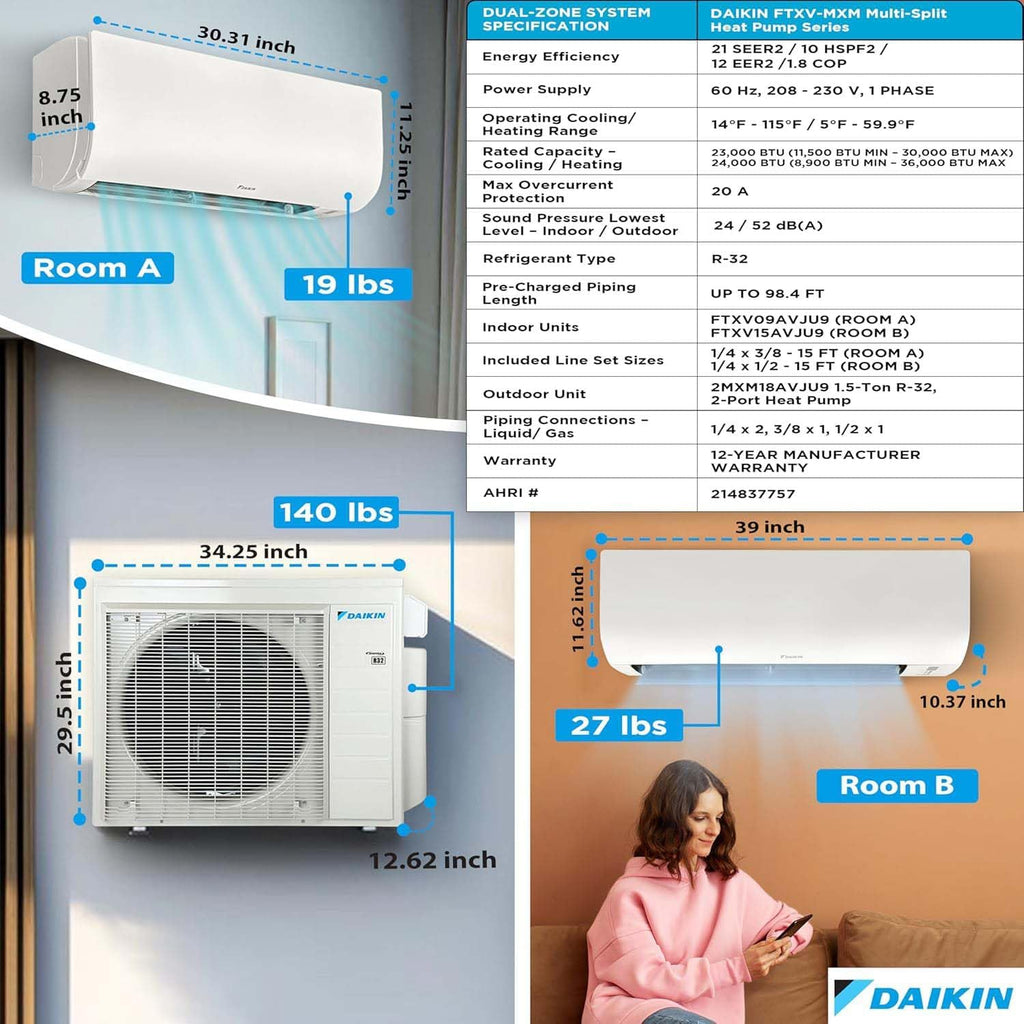 Daikin MXM 18,000 BTU (7K + 9K) 21 SEER2 Dual Zone Wall Mount Mini Split Heat Pump System - R32 - 230V