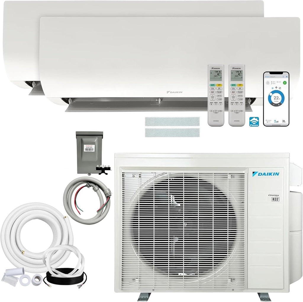 The 18,000 BTU Daikin 21 SEER2 Dual Zone Wall Mount Mini Split Heat Pump System is a high-efficiency, dual-zone solution designed to provide year-round comfort. Perfect for residential and light commercial applications, this system includes two indoor units, allowing independent climate control in two separate spaces. With advanced inverter technology, a sleek wall-mounted design, and eco-friendly R-32 refrigerant, this system ensures superior energy savings and personalized comfort.
